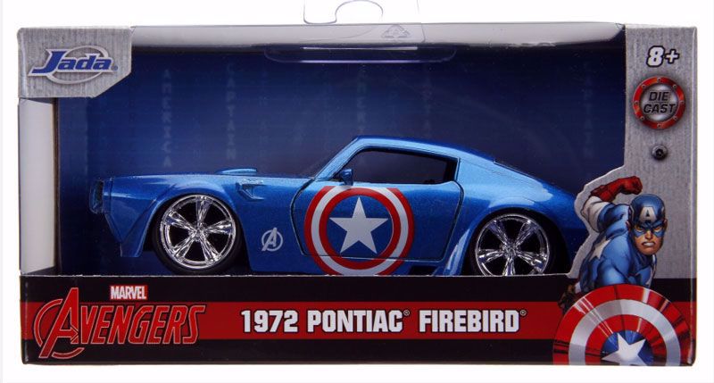 מבית המותג JADA USA מסדרת הגיבורים מודל רכב ממתכת של פונטיאק פיירבירד שנת 1972 מעוצב בהשראת קפטן אמריקה בגודל 1/32 (בערך 12 ס"מ)